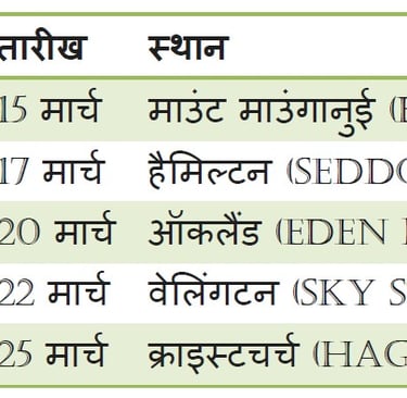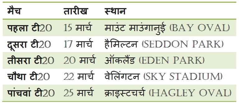न्यूज़ीलैंड बनाम दक्षिण अफ्रीका टी20 वर्ल्ड कप 2026 के तुरंत बाद न्यूज़ीलैंड और दक्षिण अफ्रीका के बीच 5 मैचों की टी20 सीरीज शुरू हो रही है। जानें न्यूज़ीलैंड की 18 सदस्यीय टीम और शेड्यूल के बारे में।