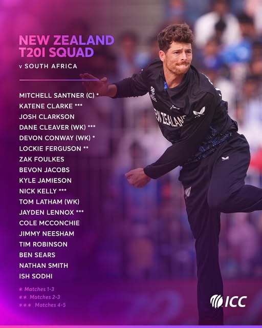 नए चेहरे: घरेलू सत्र (Super Smash) में शानदार प्रदर्शन करने वाले कातेने क्लार्क, निक केली और जेडन लेनोक्स को पहली बार टी20 टीम में शामिल किया गया है।