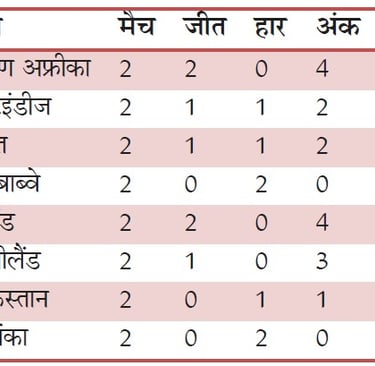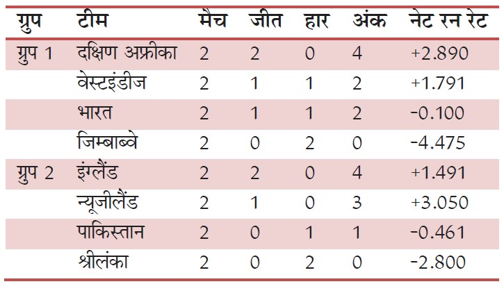 भारत और वेस्टइंडीज (गणित): दोनों टीमों के पास 2-2 अंक हैं। वेस्टइंडीज (+1.791) रन रेट के मामले में भारत (-0.100) से काफी आगे है।