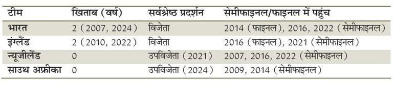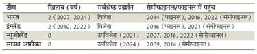 भारत (तीसरी बार का मौका): डिफेंडिंग चैंपियन भारत के पास तीसरी बार खिताब जीतने का मौका है। भारत ने सबसे पहला वर्ल्ड कप (2007) और पिछला वर्ल्ड कप (2024) जीता है।
