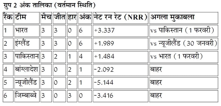 अंडर-19 वर्ल्ड कप 2026 के सुपर-6 चरण में रोमांच अपने चरम पर है। ग्रुप 2 में अब केवल एक-एक मुकाबला बचा है और सेमीफाइनल की रेस अब मुख्य रूप से तीन टीमों— भारत, इंग्लैंड और पाकिस्तान के बीच सिमट गई है। बांग्लादेश, न्यूजीलैंड और जिम्बाब्वे पहले ही रेस से बाहर हो चुके हैं। Read more...