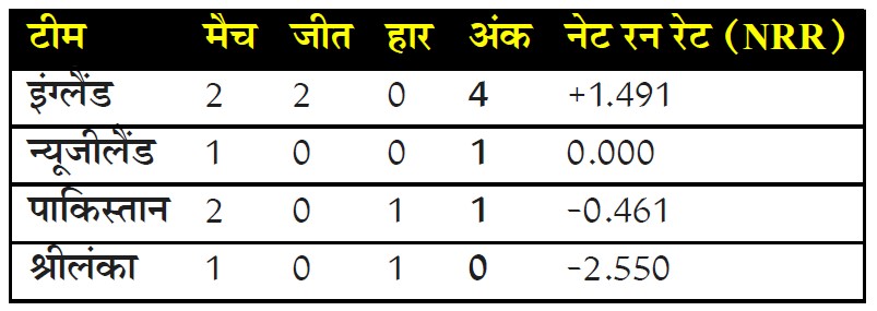 न्यूजीलैंड की जीत पाकिस्तान के लिए संजीवनी का काम करेगी। पाकिस्तान फिलहाल 1 अंक पर है। अगर श्रीलंका हारता है, तो पाकिस्तान की उम्मीदें अंतिम मैच तक टिकी रहेंगी।